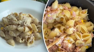 For at få en hurtig aftensmad skal du starte med at koge pastaen i saltet vand. Når de er færdige, tilsætter du en skefuld flødeost, en dåse tun i sin egen saft og majs efter smag.